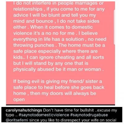 Caroline would later respond, saying she isn’t in the habit of coming in between people’s marriages except when it has to do with domestic violence. See her post below: