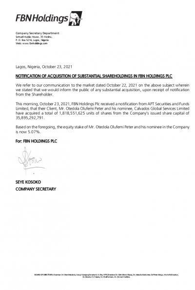 See letter below from FBN Holdings acknowledging his recent acquisition