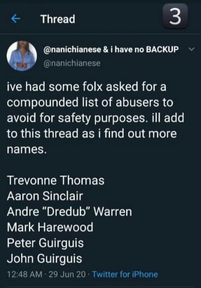 “I’ve heard some folks asked for a compounded list of abusers to avoid safety purposes. I’ll add to this thread as I find out more names,” she wrote.