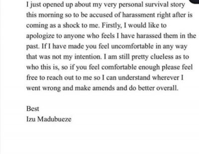 After further prodding, she disclosed the harassment was not physical but she won’t be revealing any further details. Izu then penned a note asking her to extend his sincere apology to the victim for any form of harassment he could have put her through though he was still shocked at the accusation.