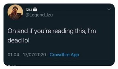 Izu would later take his life. His last tweet on July 17, reads “Oh and if you’re reading this, I’m dead lol”.
