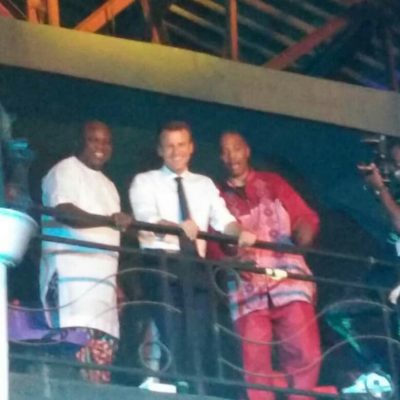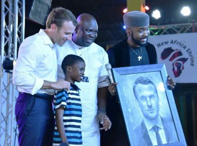 President Emmanuel Macron of France ended his first day working visit in Nigeria at the Afrika Shrine where he was received by the Lagos State governor, Akinwunmi Ambode, Femi Kuti, the eldest son of the late Afrobeat Legend, his sister, Yeni Kuti as well as members of the entertainment industry. Before making his way to his seat, President Macron took time to view an exhibition curated by Tokini Peterside of Art X.