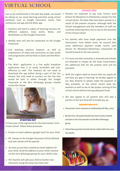 In a newsletter sent out to parents and signed by the Head of School, Mrs Elizabeth Adebayo, the school highlighted the urgent need to continue teaching their pupils to avoid any gap in learning and therefore asked parents to make prompt payment of fees to enable them adequately compensate their teachers who are running the virtual school via platforms. In addition, parents were asked to come to the school to get their children’s books adding that examination will also be done via zoom.