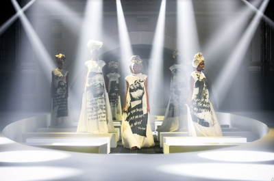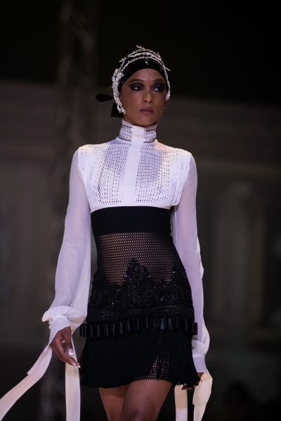David Tlale: The South African designer ended the show on the first day in his characteristic dramatic way. Monochrome, Cleopatra –like head pieces, sequins, dramatic hair styles, featured prominently in his collection.