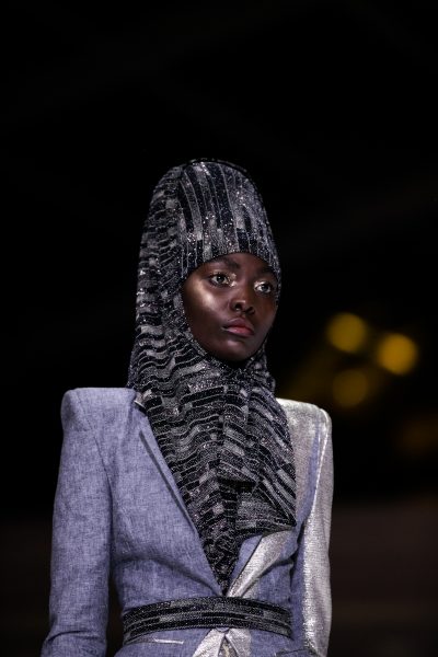 David Tlale: The South African designer ended the show on the first day in his characteristic dramatic way. Monochrome, Cleopatra –like head pieces, sequins, dramatic hair styles, featured prominently in his collection.