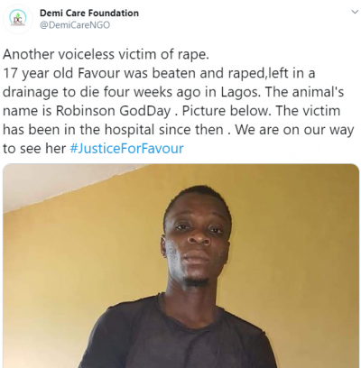A 17-year-old girl simply identified as Favour is currently lying paralyzed at the Igbobi hospital in Lagos where she is battling a spinal cord injury after she was allegedly beaten up, raped, and left inside a drainage to die by a 28-year-old man named Robinson GodDay, in the Agbarha Industrial area of Lagos state on April 23.
