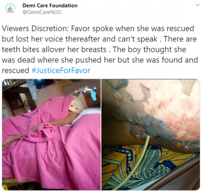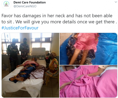 The project coordinator of Demi Care Foundation, Bimbo Oke, who shared the story online, said that Robinson is currently being detained at the Eleweran police division in Ogun state. She said the Ogun state government is fully involved in the case as they have taken up Favour’s medical expenses.