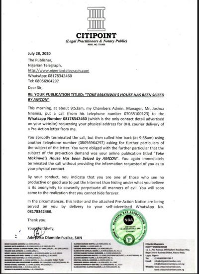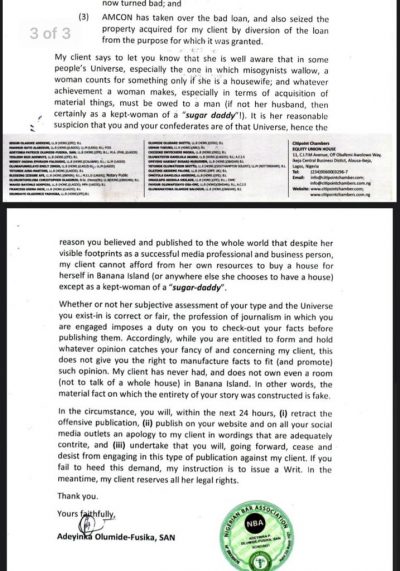 “In the circumstance, you will, within the next 24 hours, (i) retract the offensive publication (ii) publish on your website and all your social media outlets an apology to my client in wordings that are adequately contrite,” the court document, which was dated July 28, read in part.