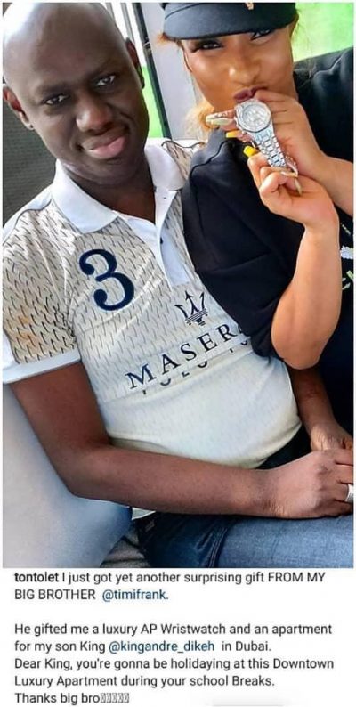 The actress had on Friday November 15th evening exctedly posted on her Instagram page that Timi Frank had gifted her a luxury wrist watch and also gifted her son an apartment.