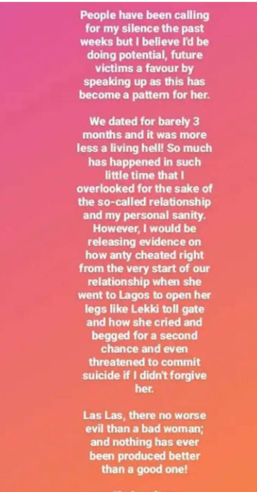 Part of his post read: “It’s glaring who really had an ulterior motive all along as exposed by her partners in crime. We dated for barely three months and it was more less a living hell! So much has happened in such a little time that I overlooked for the sake of the so-called relationship and my personal sanity.