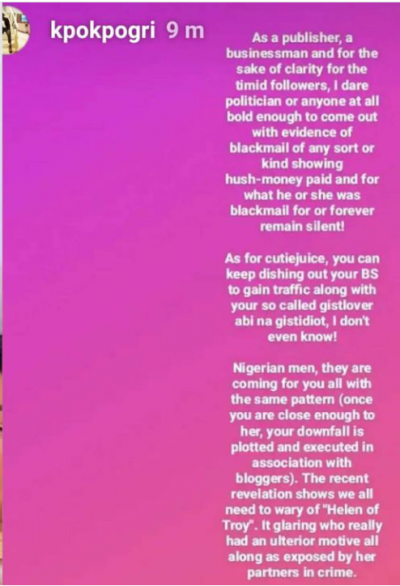 Kpokogri alleged that their relationship, which lasted for three months, was a living hell and he’s being used as the victim of blackmail.