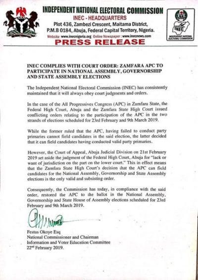 Zamfara state All Progressive Congress (APC) candidates have finally been admitted by The Independent National Electoral Commission (INEC) to participate in the 2019 general election. This follows the Court of Appeal ruling on Thursday that the electoral commission should accept candidates of the party. The state APC was barred from presenting candidates owing to an internal crisis, which did not allow the party to conduct its primaries within the time frame set by INEC.